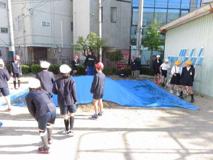 これからは砂場にはいつもビニールシートでおおって、体育の時にビニールシートを取って使うようにします。4年生の皆さん、お手伝いありがとうございました!