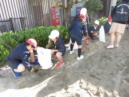今日は4年生の子ども達に手伝ってもらい、周りの土を土嚢に入れて重石にしたり新しい土を砂場にまいたりする作業をしました。