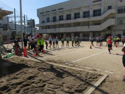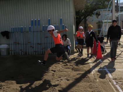 助走、踏み切り、フォームと練習してきた4年生。この学習で幅跳びが好きになった子が多くなったと担任の先生もおっしゃっていました。