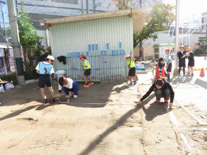 4年生は砂場を整地したあと、さっそくきれいになった砂場を使って『幅跳び大会の記録会』を行っていました。