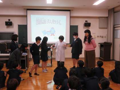 前半は、薬の種類やその飲み方について。お茶やジュース・コーラではなく、コップ一杯の水かぬるま湯で飲むのがいいことを、実際に実験を通して教えてもらいました。
