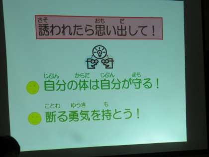 後半は、薬物の乱用について。大麻やコカインなど一度でも体の中に吸収してしまうと、元の状態には戻れなくなります。タバコも含めてそういう薬物には手を出してほしくないと思いました。