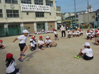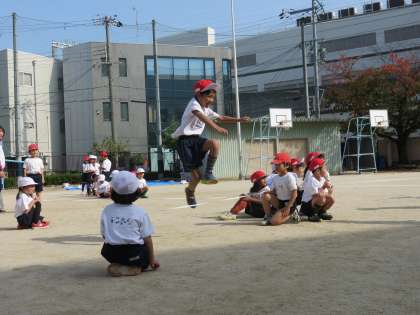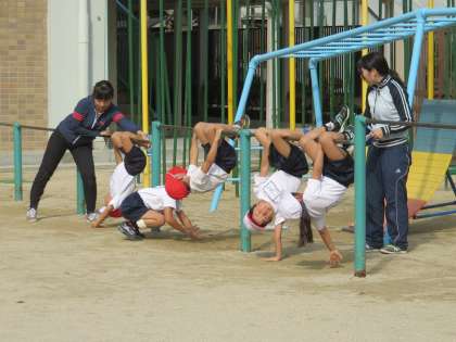 1年生が運動場で体育をしていました。ゴム跳びをしたり鉄棒で新しい技に挑戦したり・・