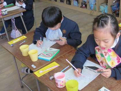 鏡で観察したり、プリントに記録したりして実際に歯ブラシを使って食紅を取る練習をしました。