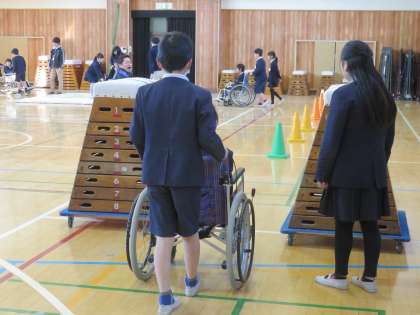 その後にグループに分かれて車いすに乗りました。段差や傾斜があったり、通路が狭かったりするコースを一人一周回りました。