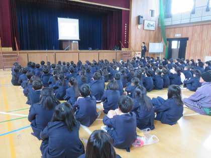 講堂では、区役所の方から災害の時に学校がどのように使われるのか話を聞いたり南海トラフ地震が起こったらどんな様子になるのかDVDで映像を見たりしました。