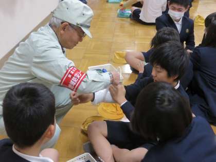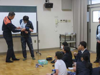 多目的室では、消防隊員の方から身近なものを使って応急手当をする方法を教えてもらいました。