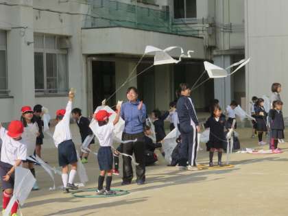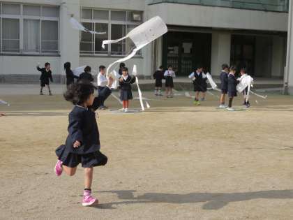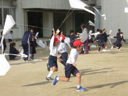 昔は冬の遊びと言えば『たこあげ』でしたが、最近はあげる場所もないので、めっきり見なくなりましたが、今日1年生が生活科で作った“凧”を運動場であげていました。