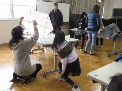 和紙を切ったり竹ひごを張ったりと、子どもには少し難しそうなので、大人も必死になって作っていました。親子が、一緒になって作るというのがいいですね!!