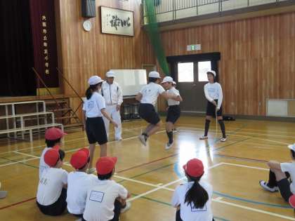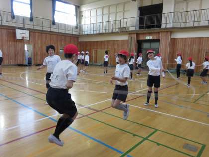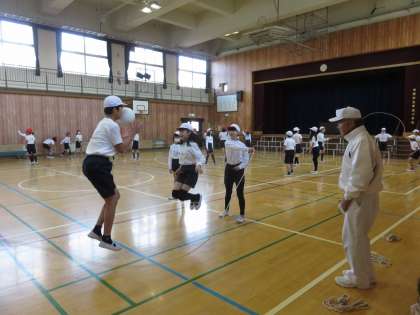 一人ずつ入って出たり、二人で入って長縄を跳びながらジャンケンをしたりボールをキャッチしたりしました。
