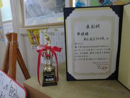 ソフトボール大会でもらった賞状とトロフィーは校長室前に飾りました。