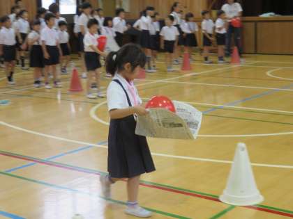 ルールは簡単。新聞紙の上に風船をのせ、コーンを回って次の人に交代していきます。
