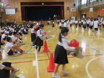 今日の児童集会は、たてわり班ごとに『風船運びリレー』をしました。