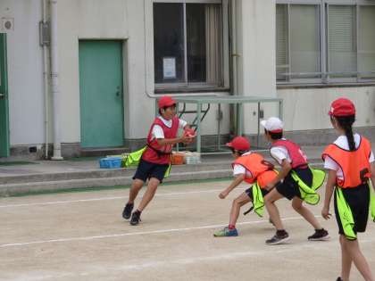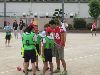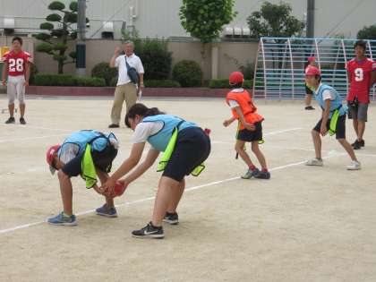 今日は地域の方や大阪経済大学でフットボールをしている大学生5〜6名がボランティアに来ていただき、5・6年生の子ども達に『フラッグフットボール』を教えてくれました。