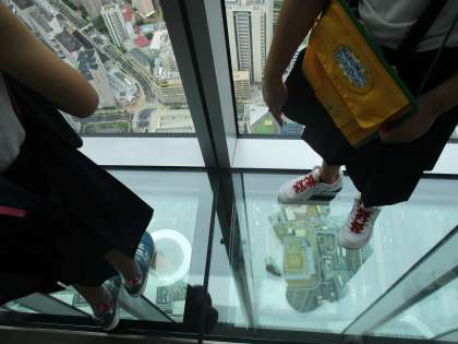 わくわくドキドキしながらエレベーターに乗って、60階にある「あべのハルカス」の天井回廊へ……。東西南北360度に広がる大阪の街をじっくり見学しました。北には大阪城、西には大阪港や明石海峡大橋、南には長居公園、東には生駒山など遠くの方まで見ることができました。また、眼下には通天閣や天王寺動物園も見えたり、床がガラスになっていて下まで見えるところもあったり、とても楽しく学習していました。