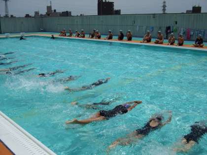 4時間目に入った6年生は、水慣れ・バタ足・クロール・平泳ぎ…