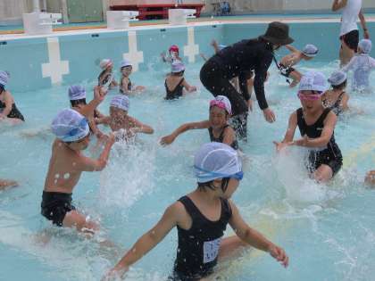 今日はプール掃除の関係もあり、1年生がプールに入るときには、ちょうど水遊びをするのにぴったりな水の量でした。