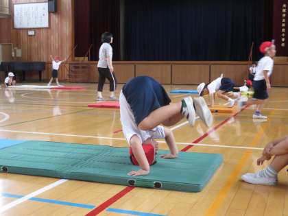 マットを使って、前まわりをしたり足を上に突き上げたり・・日頃あまりしない動きもやっぱり練習が一番!がんばって練習してくださいね!
