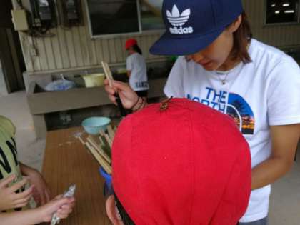 帽子にトンボが止まっています。