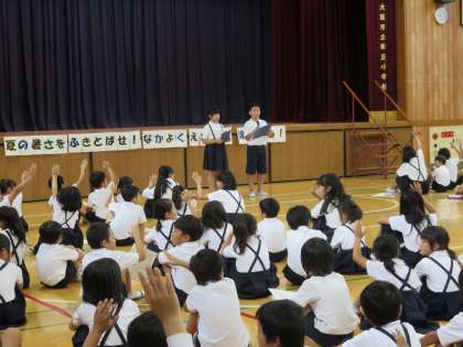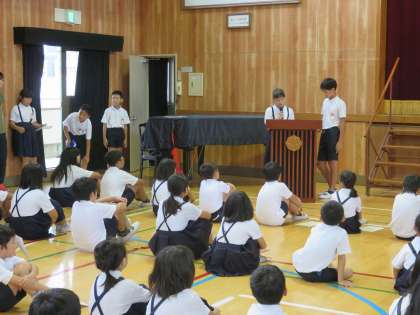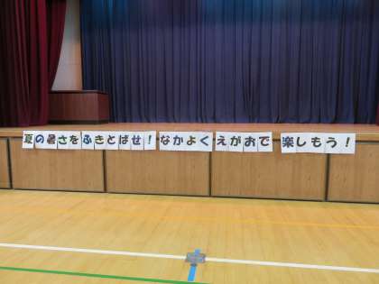 9時40分、全員が講堂に集まりました。今年のめあては「夏の暑さをふきとばせ!なかよく えがおで楽しもう!」です。