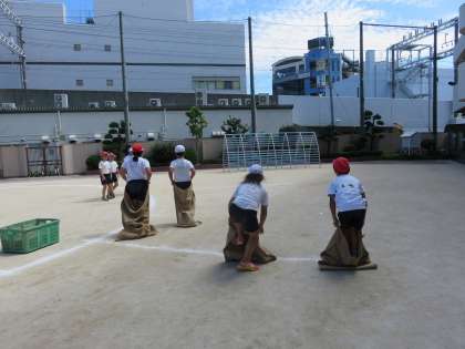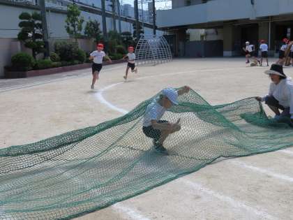 ハードルを跳びこえ、砂袋に入って移動し、最後は網をくぐってゴールを目指します。