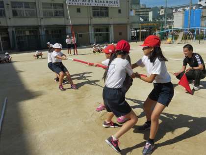 今日は雨が降っていて、どの学年も運動場は使えませんでした。昨日写真を撮っていた5年生の棒引き(競技名『棒引きGO!』)を紹介します。