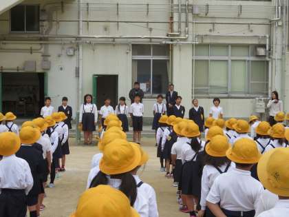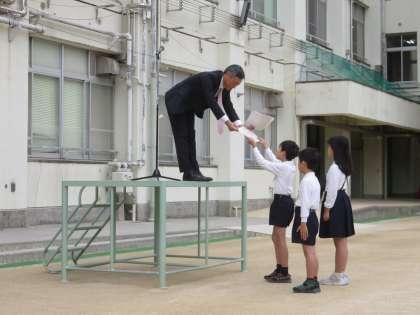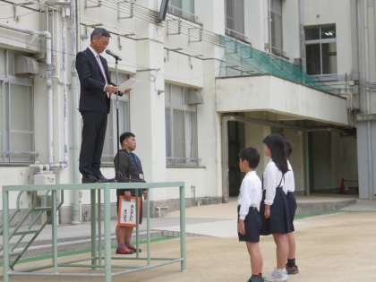 今日の全校朝会で、夏休みに募集していた『あいさつの標語』の表彰式を行いました。