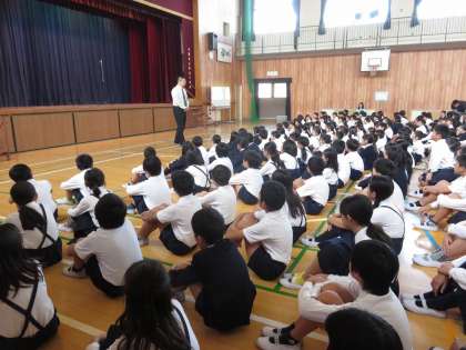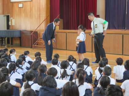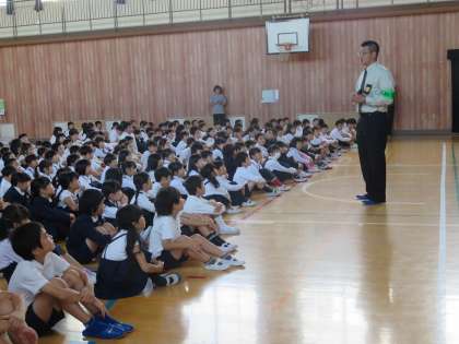 今日の児童集会では、東淀川警察署から2名の方に来ていただき、子ども達に『自分の身は自分で守る』防犯の話をしていただきました。