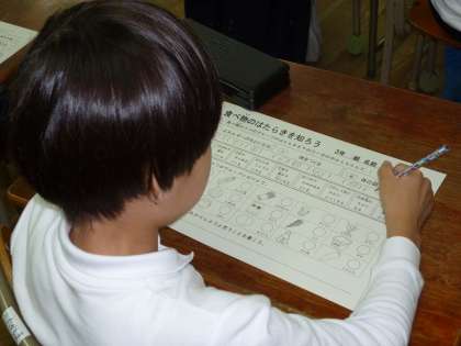 そして、今日の給食のメニューに使われている食材は何色の食べ物か、ワークシートに色分けをしました。