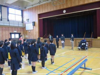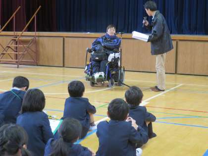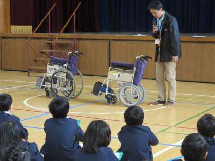 3時間目は、“福祉(ふくし)”について、子ども達にも分かりやすく説明していただき、その後に実際に車いすで生活をしている方から、生活していてうれしかったことや大変だったことなどの話をしていただきました。