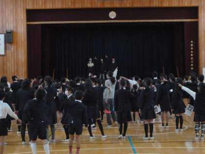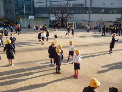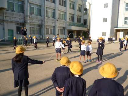 そこで、今日の集会は運動場で班ごとに大なわとびをしました。(全部の班が一斉に行うのは無理なので今週は半分。残りの班は講堂でゲームをしました。)