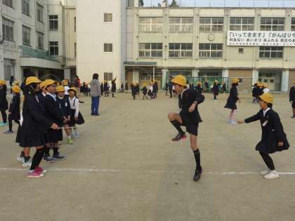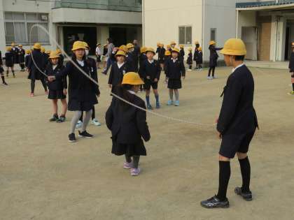 運動場ではたてわり班ごとによる“長なわ跳び”です。高学年がなわを回し、八の字跳びをしたり、低学年の子は走り抜けたりしました。