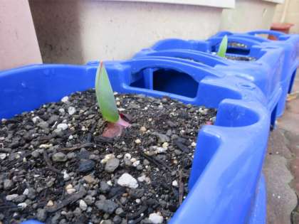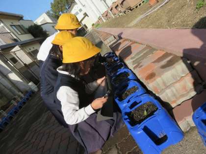 1年生が育てているチューリップの芽が出ました。これから春にむけて、どんどん大きく育っていきます。
