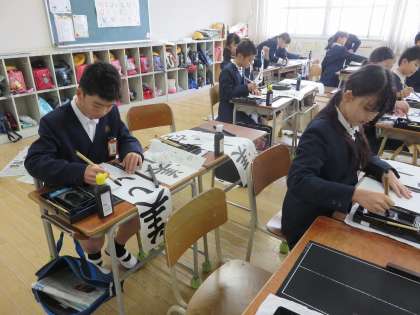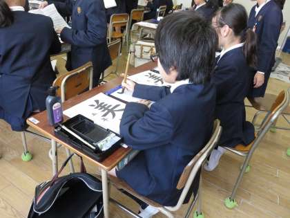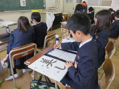 半紙よりも長い書き初め用紙に書くのは、やはり緊張するようで、みんな一生懸命にお手本を見ながら書いていました。