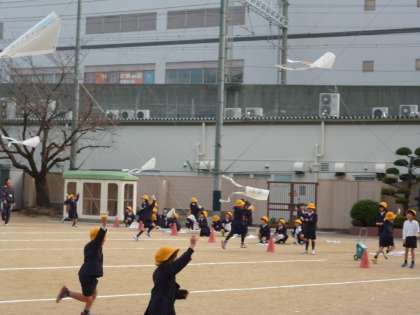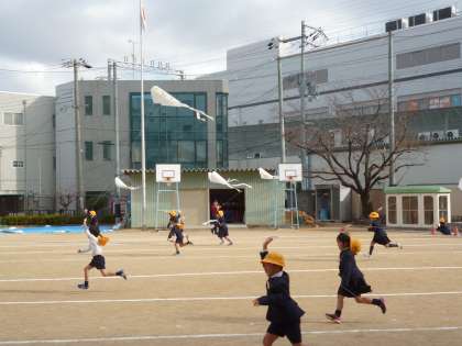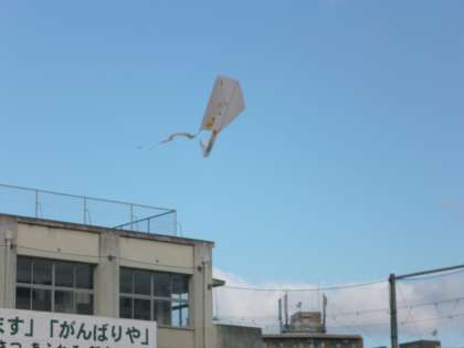 糸がからまないよう一列に並んだ1年生は、一気に駆け出し空高く凧が揚がっていきました。空に揚がる凧を見つめる顔は、みんなとびっきりの笑顔でした。