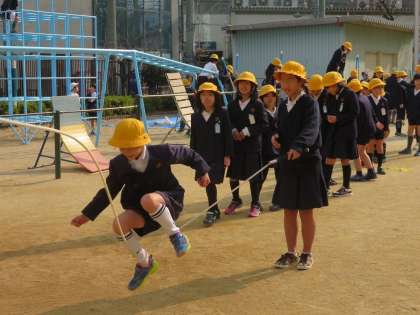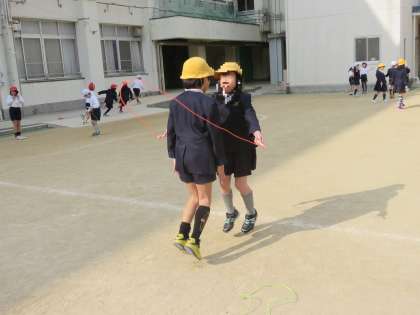 一生懸命になわとびをしている子がたくさん。友だち同士二人でなわとびを跳んだり、クラスによってはクラスみんなで長なわをしているところもありました。