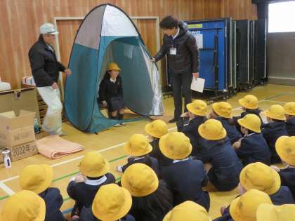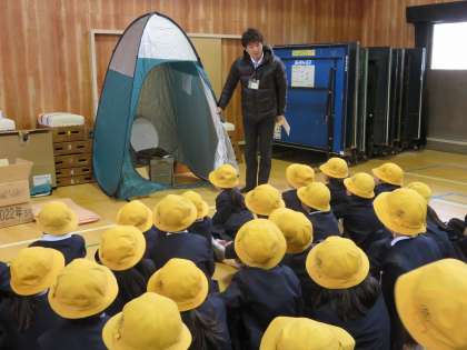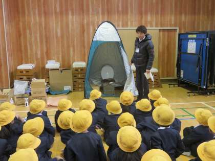 講堂では、学校に備蓄物資として保管している物資の使い方を、区役所の方から教えてもらいました。