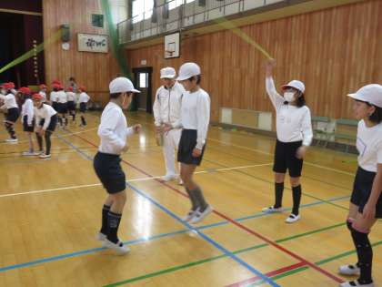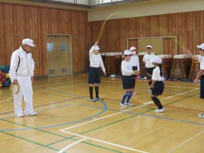 長縄をただ跳ぶだけではなくて、二人で跳んで中でジャンケンをしたり、ボールをキャッチボールしたりしていました。