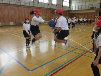 二人でタイミングを合わせて一緒に跳ぶ。跳びながらジャンケンをする。ボールを投げて受け取る。・・二つ、三つの動作を一度にするのはとても難しいですが、子ども達は、練習するとどんどん上達していきました。