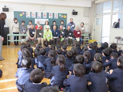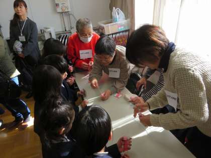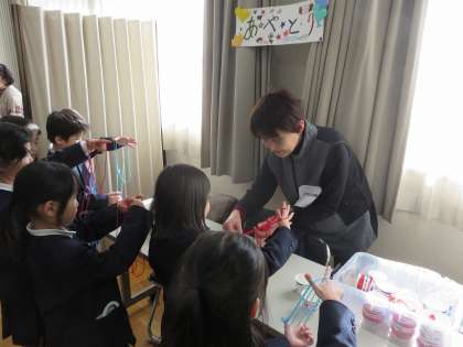 今日の5時間目は今年度最後の学習参観でした。1年生はその学習参観で、地域の方をお呼びして『昔あそび』を子ども達に教えてもらいました。