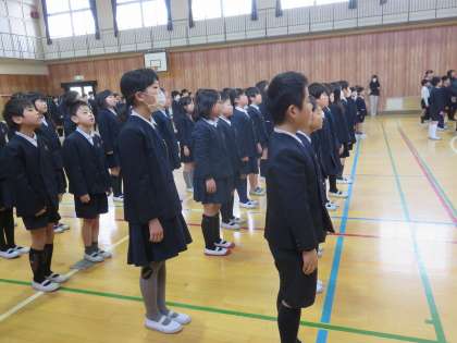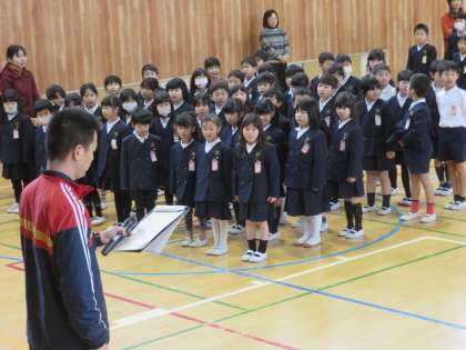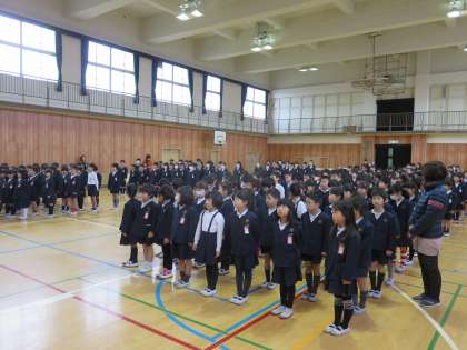 今日の朝は、1〜5年生が講堂に集まり児童集会をしました。2月26日に予定している『卒業を祝う会』の練習をするためです。