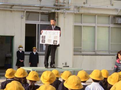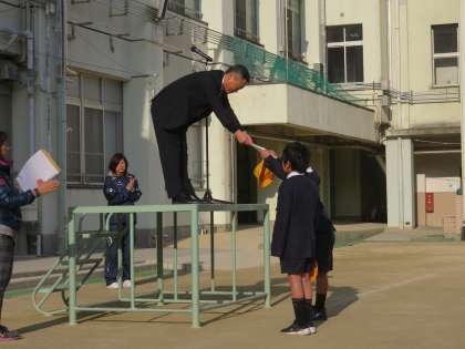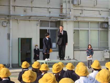 今日の全校朝会では、新しく新庄小に来てくれたお友だちを紹介したり、図工の作品で表彰された二人に賞状を渡したりしました。