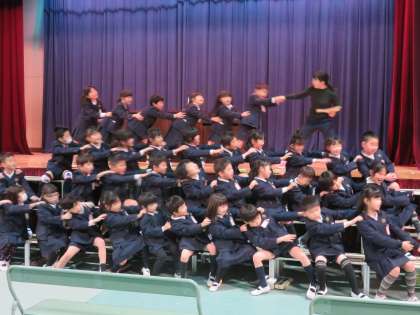 1年生が4月5日(金)に行う入学式での『お祝いの演技』の練習をしていました。