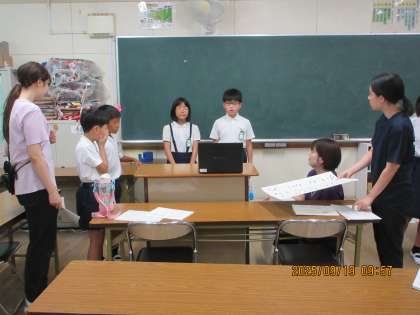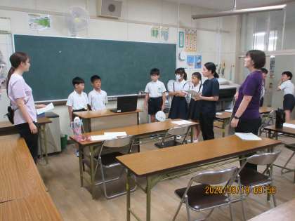本日、2〜4限目までを使って、夏のつどいを行いました。どの学級も、とてもアイデアに富んだお店になっていて、楽しい時間を過ごすことができました。お店版の子どもたちは、各々が役割を果たし、たてわり班で回る子どもたちは、協力してスムーズに進行することができました。子どもたちの楽しそうな笑顔がたくさん見ることができました。まずは、委員会の挨拶からスタートです。