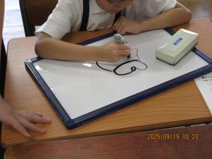 提示された似顔絵を見た後、一人ずつ一つのパーツを描くことにチャレンジします。
