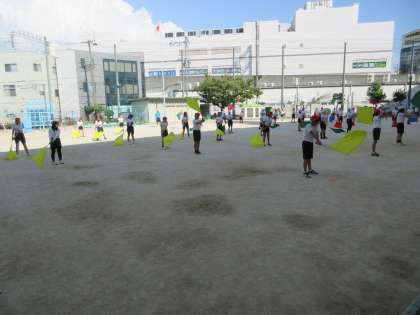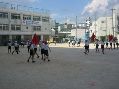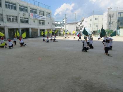 今日は、運動場で練習をしました。旗を振るときの音が、昨日より鋭い音になっていました。