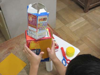 お家から持ってきた箱で動物を作ります。先ずは、折り紙を箱に貼っていきます。