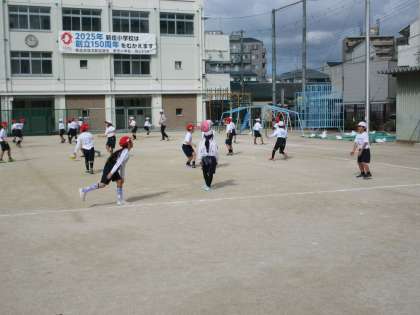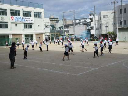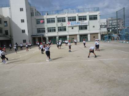 ドッヂボールを想定してボールを受ける人が動いたり、間にいる人が動いたりしながらボール運動をしました。