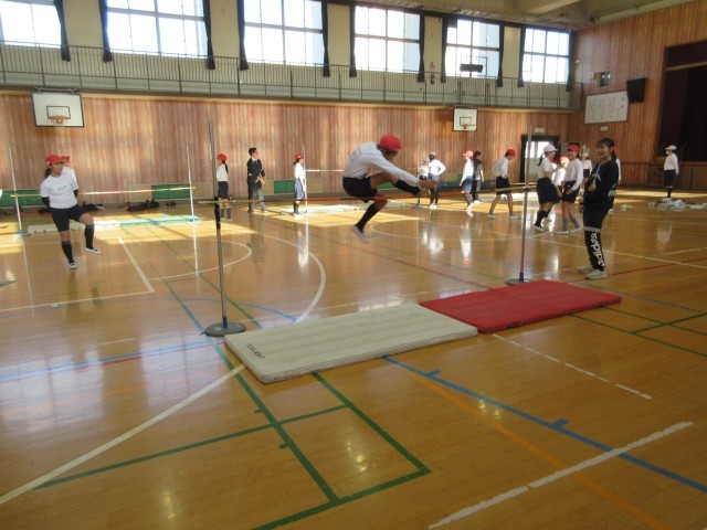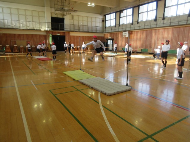 高跳びをしています。それぞれが高さの目標を決めて、クリアを目指して練習しています。
