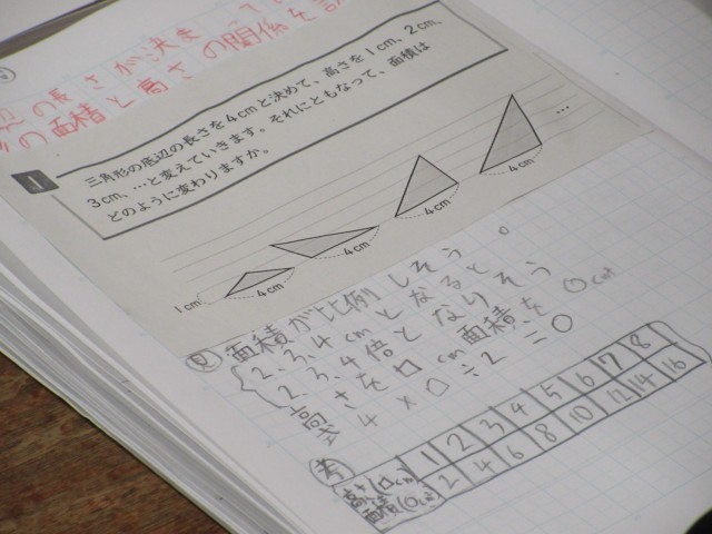 底辺の長さが決まっている三角形の高さと面積の関係について、学習しました。